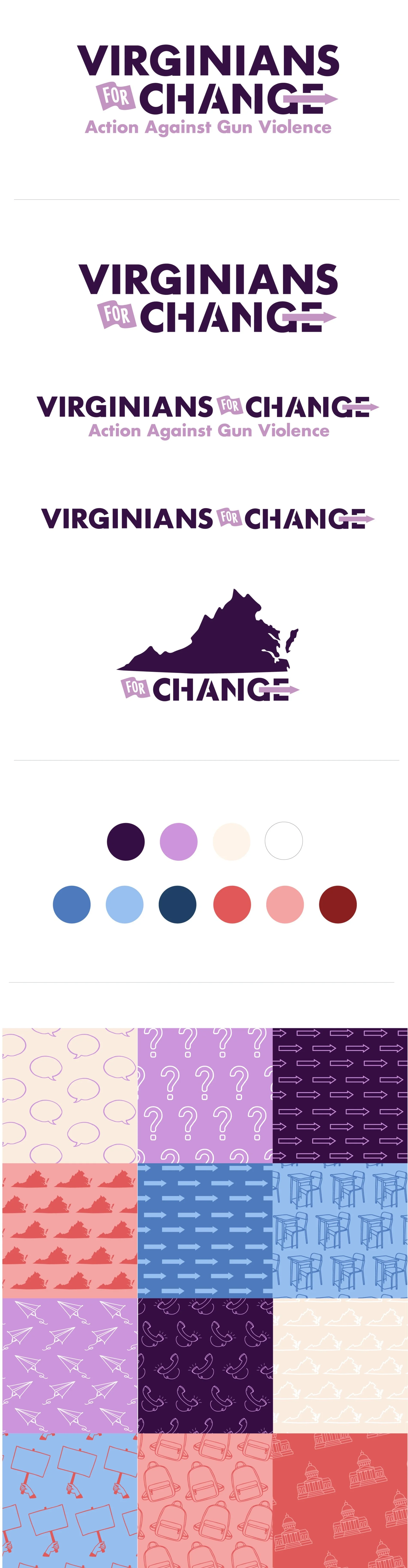 Logo for Virginians for Change, an organization against gun violence, with different variations of the logo and a color palette. The logo features the organization's name in bold purple text, with the word 'for' inside a small purple rectangle, and an arrow integrated into the letter 'E' in 'Change'. The logo also includes a silhouette of the state of Virginia and various background pattern designs with social activism themes.